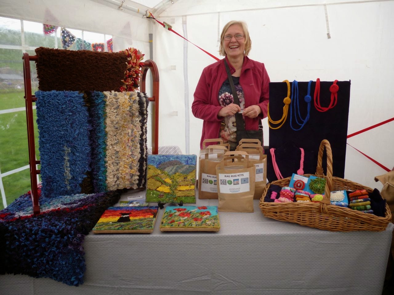 A very smiley stall holder with more rug hooking.